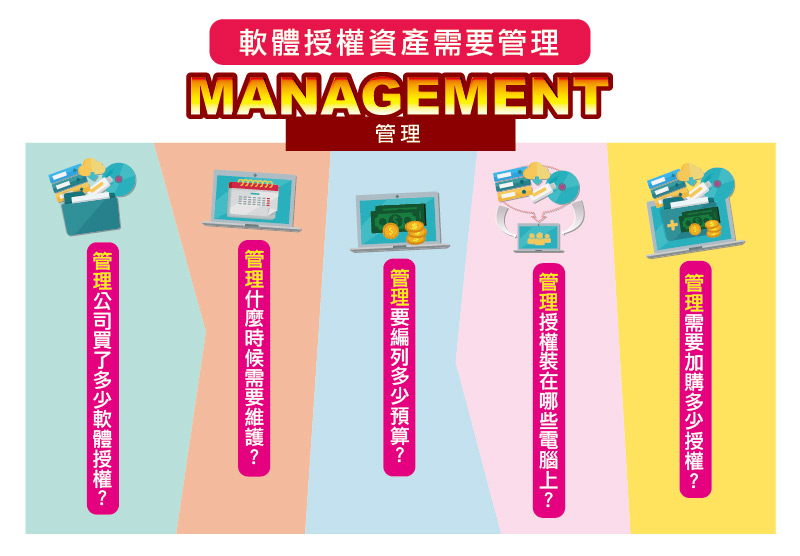 Asset Management: Includes software asset management and software installation management Enterprise purchases of new versions of legal and genuine network software are registered as assets just like work computers, both must be online and constantly updated, ideally managed by IT/MIS as a single controlling unit.