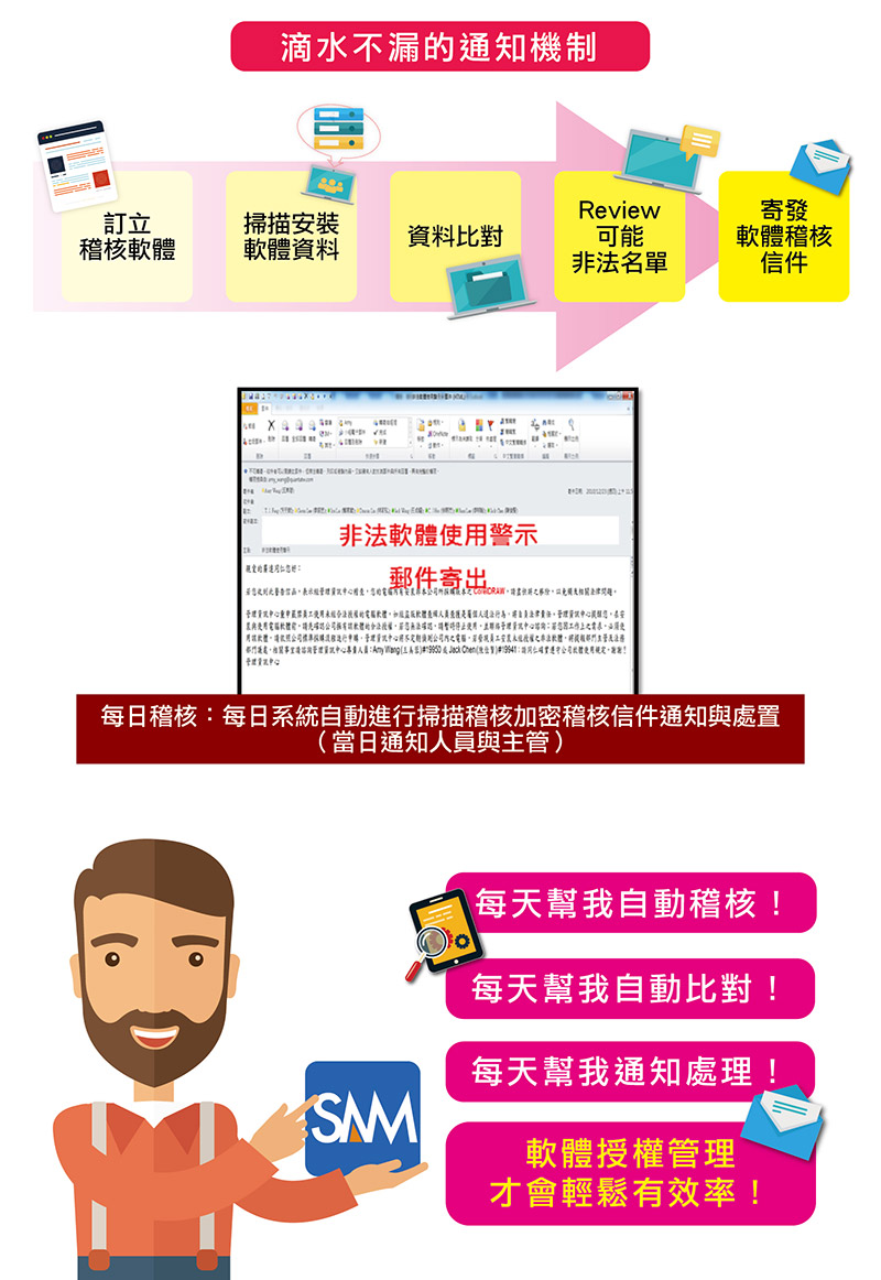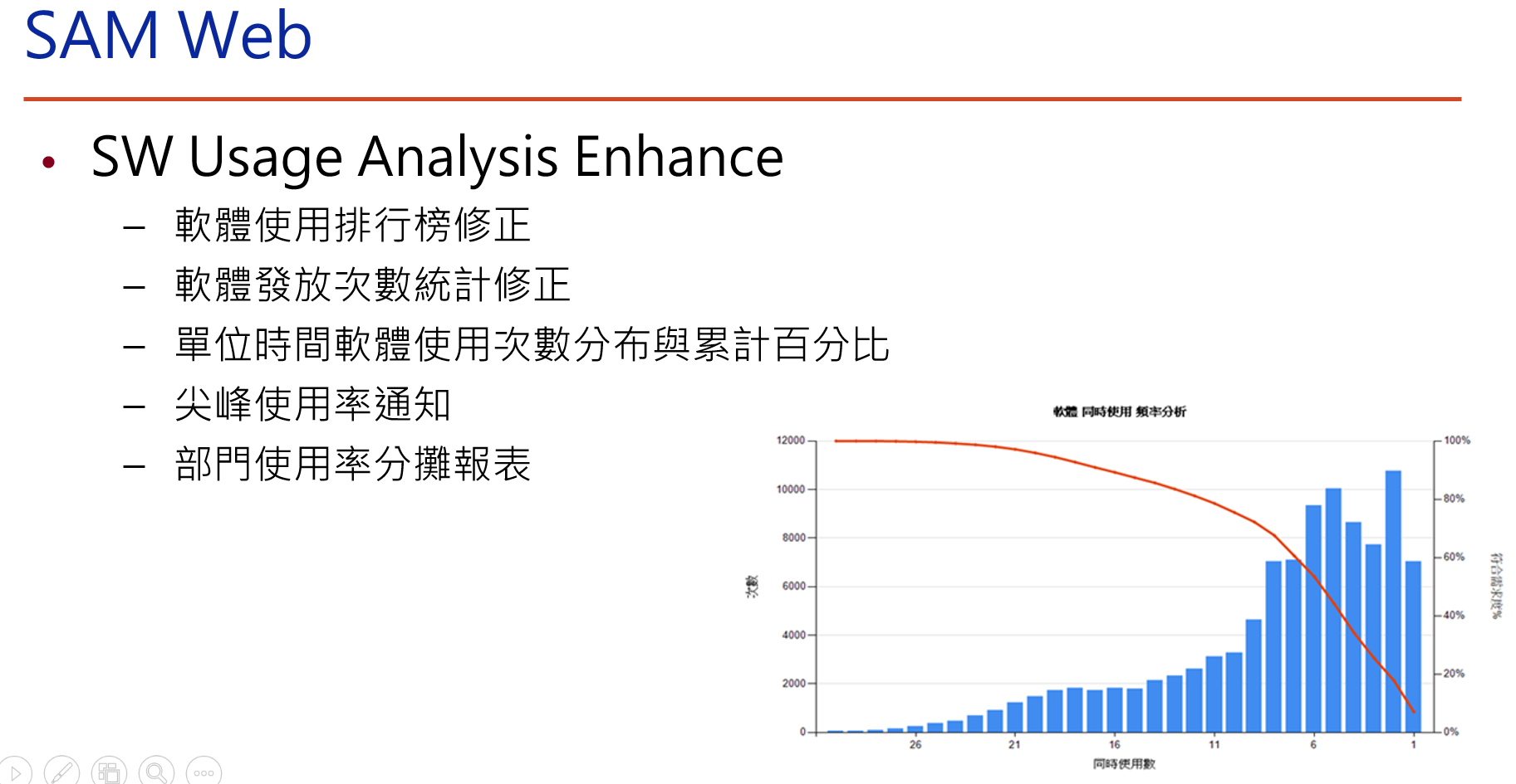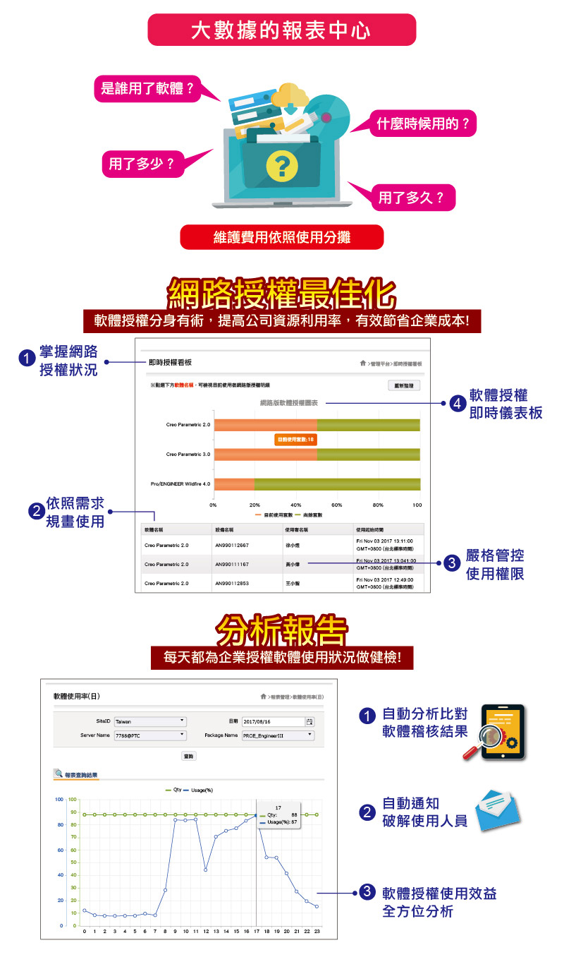 Management Platform: Includes reporting center and notification mechanism When business units allocate annual budgets for tool software, there isn’t a data-supported report as a reference. Through the management platform, information such as who, which department, when, what software, and how long it was used can be obtained. Budgets for new software purchases through maintenance fees in subsequent years are then apportioned based on the actual usage rates of the business units.