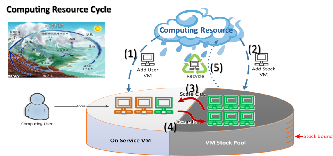 Automated Horizontal Scaling MechanismProvides a concept similar to water resource recycling combined with load balancing mechanisms, automatically scaling virtual machine computing resources according to demand, quickly and agilely responding to needs, and intelligently adjusting to increase or decrease the usage of computing resources. This achieves computing flexibility, cost savings, and increased energy efficiency.