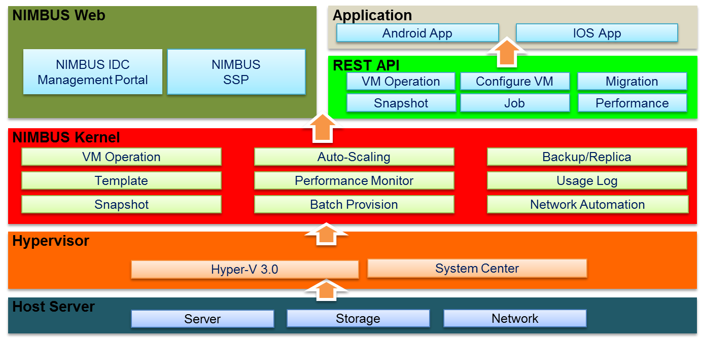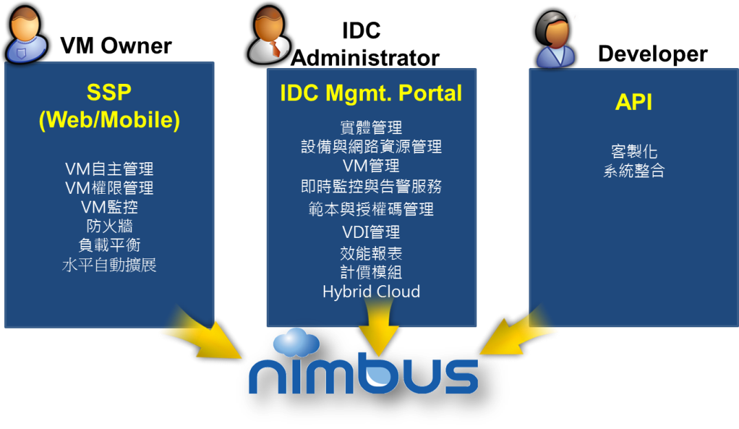 Hybrid Cloud ArchitectureNIMBUS can integrate with Far EasTone Public Cloud, and can also temporarily utilize public cloud hardware resources when enterprise private cloud hardware resources are insufficient.