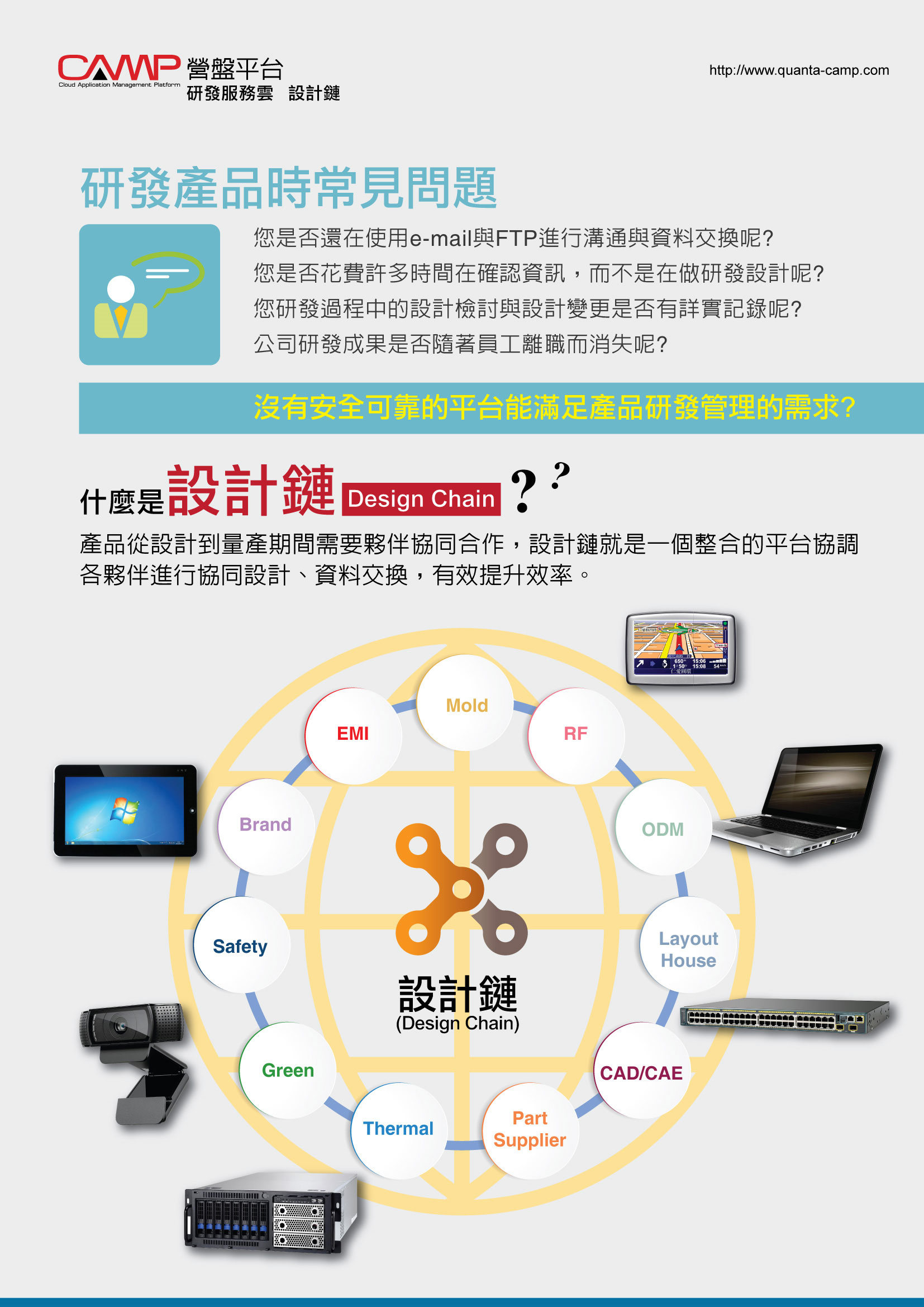 Each product, from concept, design, testing and verification, to mass production, requires collaboration across multiple companies, such as integrating communication between different company personnel and managing data exchange. The "R&D Services Cloud" - Design Chain Management is a cloud solution developed to address personnel and data management during the design phase. The collaborative design platform, based on a corporate community structure, provides a consistent, secure data exchange mechanism, effectively managing files or documents generated during the design phase. Achieves Secure Access, Get Connected, Share Information, Work Together goals of the design supply chain.
